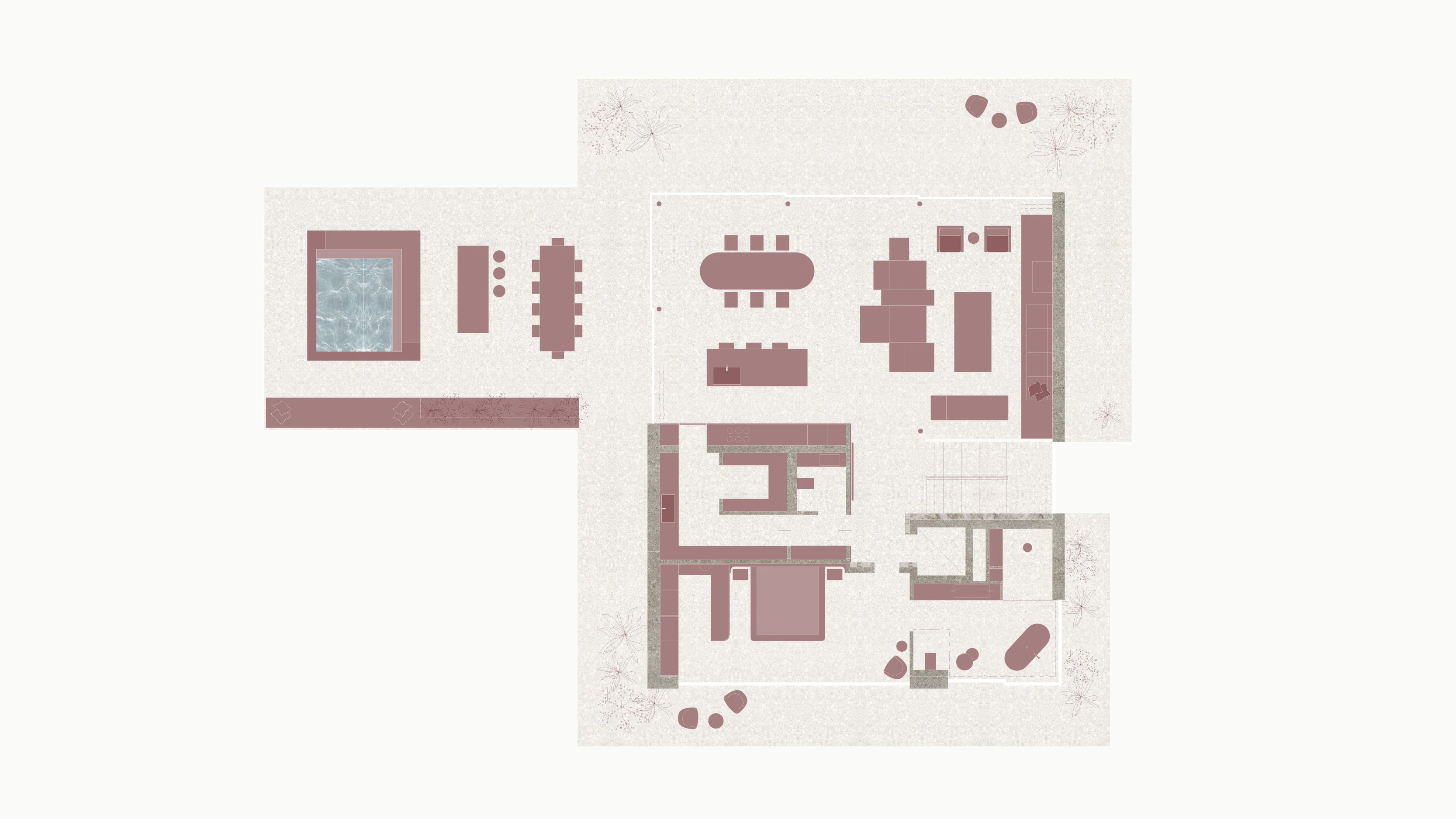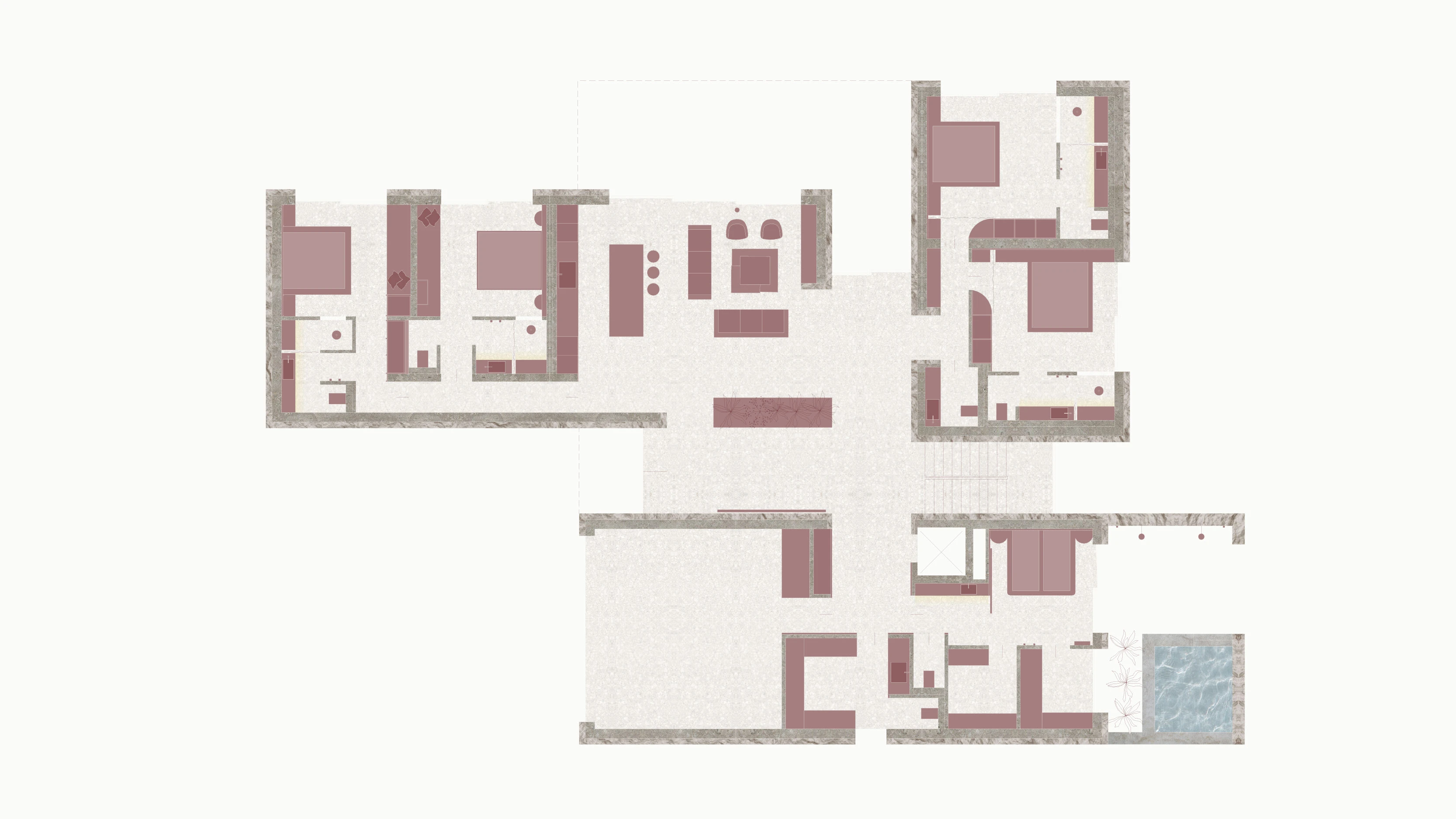Für ein Projekt von Atelier Architekt Palme gestalten wir das Interior einer großzügigen Villa auf Mallorca. Der Entwurf sieht vier Gästezimmer sowie einen separaten Schlafbereich für den Eigentümer vor – jeweils mit direktem Zugang zu Bad und Garderobe. Ergänzt wird das Raumprogramm durch einen Wellnessbereich mit Sauna und Außenraum, Heimkino, Fitnessraum, Weinkeller und Bar. Zwei Wohnküchen auf unterschiedlichen Ebenen strukturieren das Haus funktional: Im Erdgeschoss befindet sich ein offener Wohnbereich für Gäste – mit direktem Bezug zum Garten. Im Obergeschoss dient ein zweiter, großzügiger angelegter Wohnbereich als zentraler Raum des privaten Rückzugs für den Eigentümer.